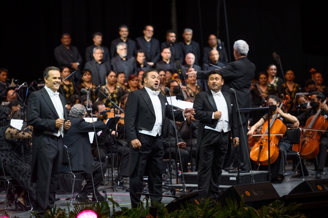 Este espectáculo de calidad mundial conquistó los corazones de los asistentes por la interacción de los tenores con el Coro Normalista y la Banda Sinfónica de la Secretaría de Seguridad Pública (bajo la dirección de Enrique Patrón de Rueda), quienes interpretaron un popurrí de canciones mexicanas, entre ellas “Cuando calienta el sol”, «Perfume de gardenias» y «Granada», del compositor mexicano Agustín Lara.