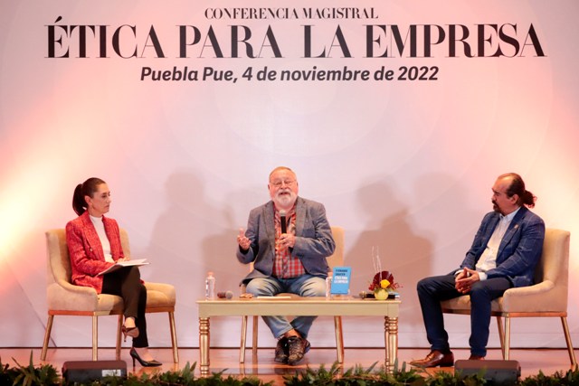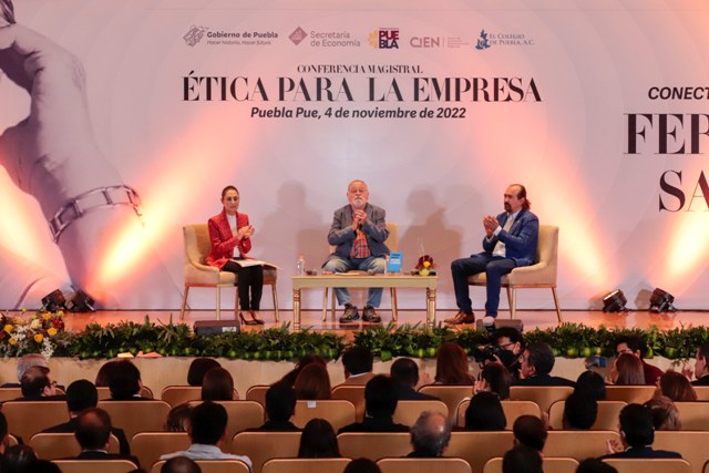 En el evento desarrollado en el Museo Internacional del Barroco, el mandatario, acompañado de la señora Rosario Orozco Caballero, integrantes del gabinete y público en general, escucharon las consideraciones que el escritor y Sheinbaum Pardo compartieron sobre las virtudes con las que deben de contar los empresarios y la vinculación que debe existir con la política para que prevalezca el bien común.