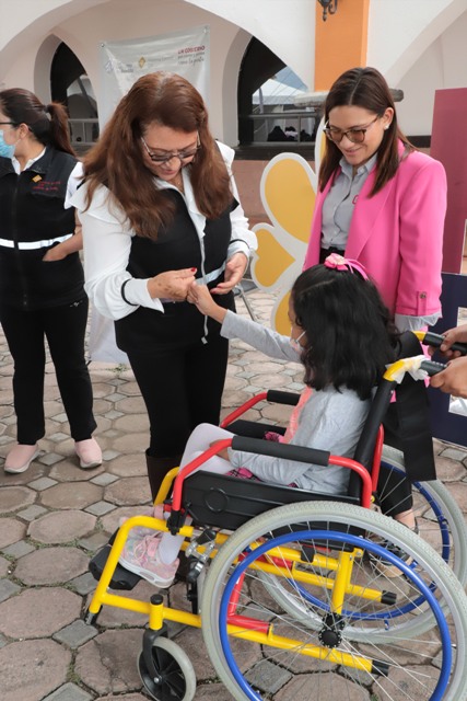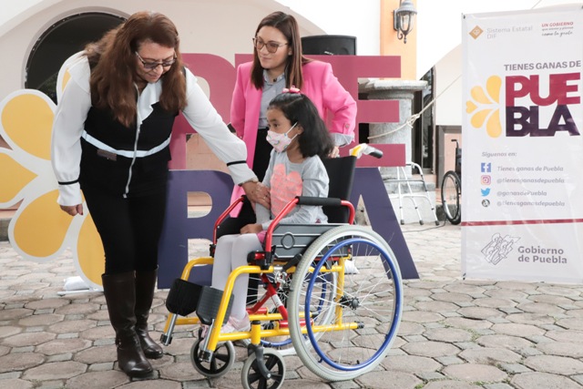 TLACHICHUCA, Pue. – El Sistema para el Desarrollo Integral de la Familia del Estado de Puebla (SEDIF) llevó a cabo la jornada de “Martes Ciudadano”, tanto en este municipio como en las oficinas centrales del organismo, donde las niñas Aura Sofia Salmerón, originaria de Tlachichuca y Yessica Vázquez Ballinas, quien padece hidrocefalia y vive en la colonia Tres Cerritos de la capital, fueron beneficiadas con sillas de ruedas infantiles, con las cuales sus familiares podrán trasladarlas de manera segura y cómoda a sus terapias.