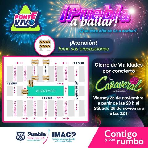 - El Ayuntamiento de Puebla encabezado por Eduardo Rivera, invita al concierto de “Grupo Cañaveral” este sábado para iniciar las actividades de fin de año, habrá cierres parciales al paso.