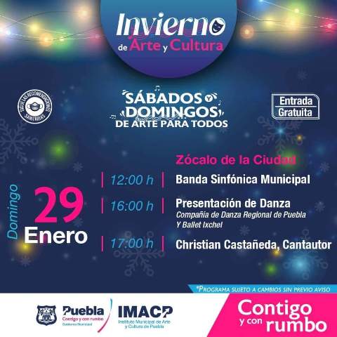 El domingo 29 de enero en el Zócalo habrá diversas actividades, a las 12:00 horas se presenta la Banda Sinfónica Municipal, a las 16:00 horas es turno de la compañía de Danza Regional de Puebla y Ballet Ixchel y a las 17:00 horas el cantautor Christian Castañeda alegrará la tarde con sus canciones; y a las 18:00 horas el Teatro de la Ciudad abre sus puertas para escuchar la “Música del Silencio: La música de las compositoras olvidadas”.