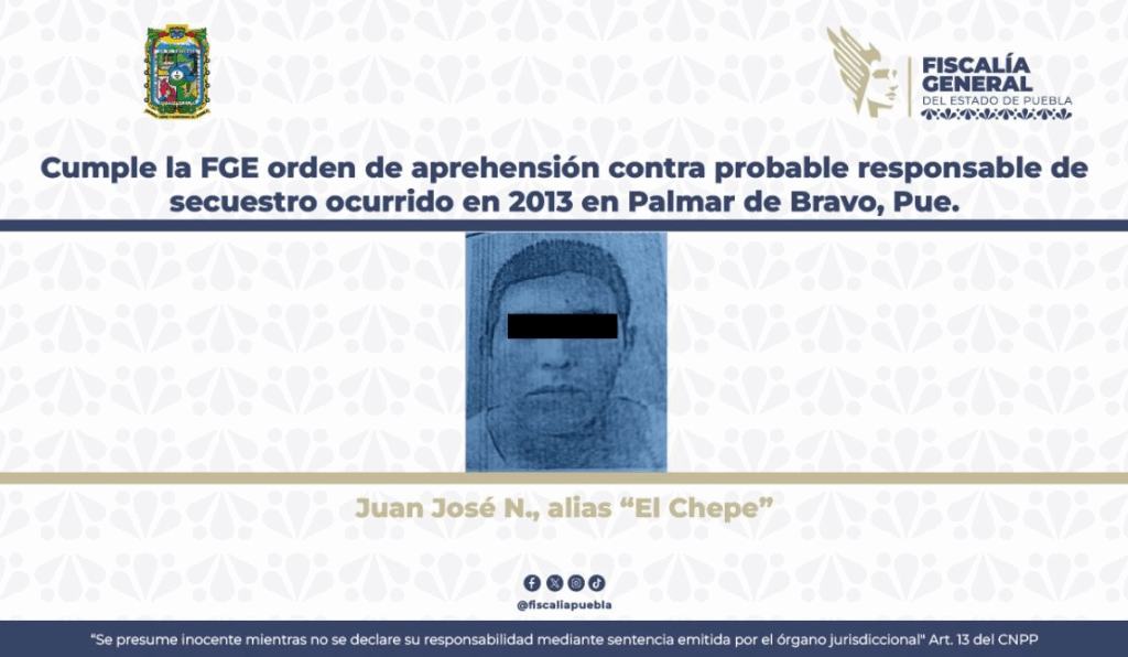 La Fiscalía General del Estado de Puebla cumplimentó la orden de aprehensión por reclusión en contra de Juan José N., alias “El Chepe”, de 45 años de edad, como probable responsable del delito de secuestro, ocurrido en el municipio de Palmar de Bravo, Puebla.