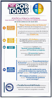 Eje 3 (Ciudades seguras): Por parte del Instituto Municipal de las Mujeres del ayuntamiento capitalino, se impartieron dos talleres sobre “Nuevas masculinidades” en el cual participaron 65 hombres y 32 mujeres. Adicionalmente, se brindaron 24 asesorías legales y psicológicas gratuitas.