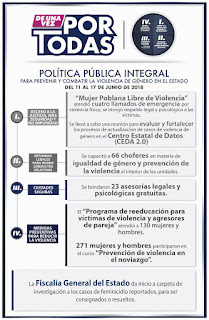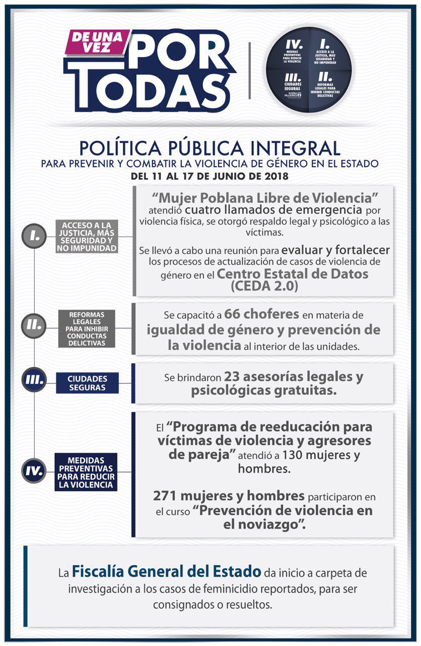 Puebla, Puebla.- Sin descanso y con la firme convicción de erradicar la violencia de género, la estrategia “De Una Vez por Todas” continúa con la operación de sus distintos ejes y durante la semana del 11 al 17 de junio alcanzó los siguientes resultados: