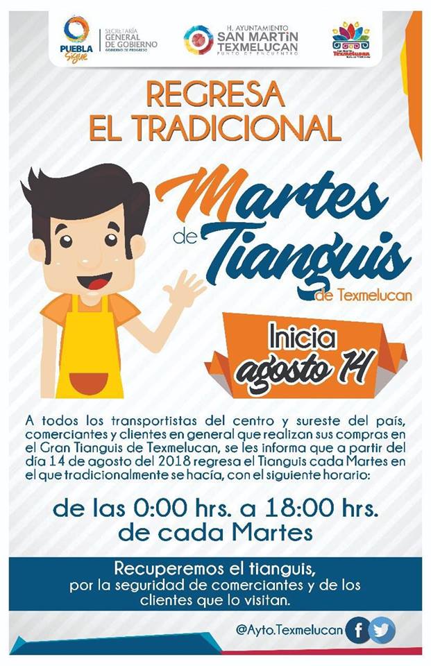 Como parte de los trabajos coordinados entre el Gobierno del Estado de Puebla, el de San Martín Texmelucan y las Organizaciones Tianguistas, se fortalece la difusión respecto a que a partir del 14 de agosto, el tianguis regresará al tradicional martes en un horario de 0 horas a 6 de la tarde del mismo día.