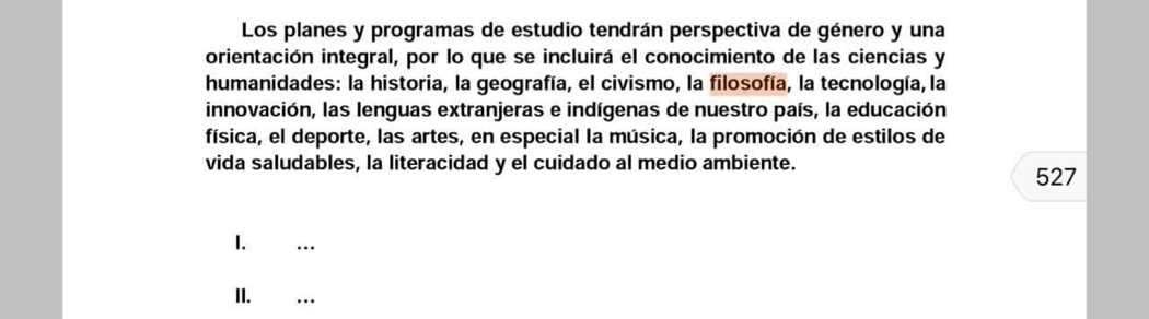 En lo que respecta al avance en materia legislativa la palabra “filosofía” apareció por primera vez en el pre-dictamen de las comisiones unidas de educación y puntos constitucionales en la versión del día martes 12 de marzo a las 22:30 hrs.