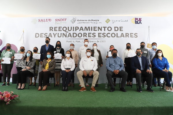 CIUDAD DE PUEBLA, Pue.- En beneficio de más de 10 mil infantes de 41 municipios de alta y muy alta marginación, el gobernador Sergio Salomón Céspedes Peregrina y su esposa, la presidenta honoraria del Patronato del SEDIF, Gabriela Bonilla Parada, encabezaron el reequipamiento de 45 desayunadores escolares, acciones de dignificación que permitirán que niñas y niños puedan tener una mejor alimentación y con ello impactar su desarrollo físico y académico.