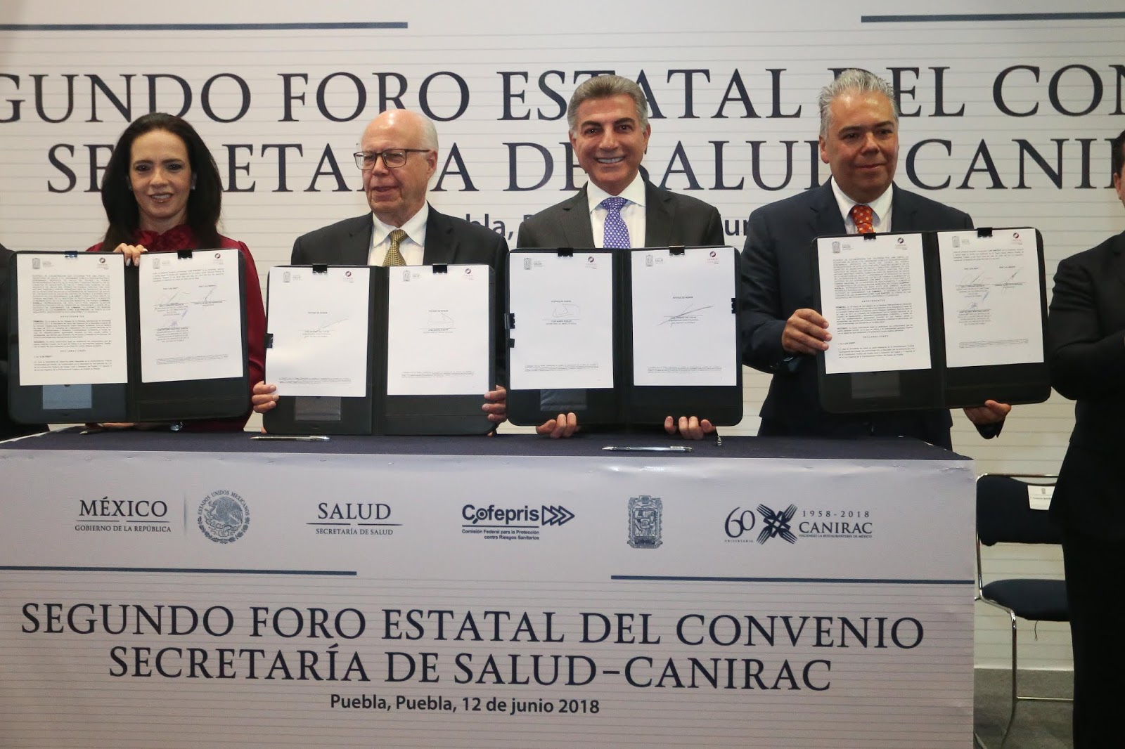 San Andrés Cholula, Puebla.- El Secretario de Salud federal, José Narro; el gobernador Tony Gali; la titular de los Servicios de Salud del Estado de Puebla, Arely Sánchez y el Presidente de la Cámara Nacional de la Industria de Restaurantes y Alimentos Condimentados (CANIRAC) delegación Puebla, Ignacio Alarcón, firmaron un convenio de colaboración por la Estrategia Nacional para la Prevención del Sobrepeso, la Obesidad y Diabetes.