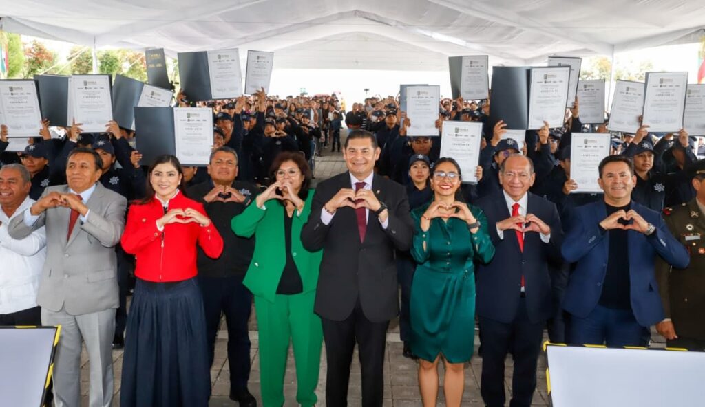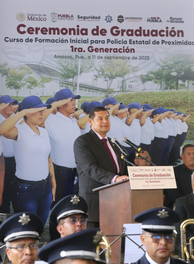 AMOZOC, Pue.- Al asistir a la ceremonia de graduación de 122 Cadetes del Curso de Formación Inicial para Policía Estatal de Proximidad de la Universidad de las Ciencias Policiales y de la Seguridad (UCIPS), el gobernador Alejandro Armenta señaló que para su gobierno cuidar a quienes protegen a las familias es una misión. «Nosotros cuidamos a sus familias para que ustedes protejan a los poblanos, es el compromiso. No están solos», aseguró el mandatario, al tiempo de reconocer que se formaron con valores que permiten proximidad con la población.