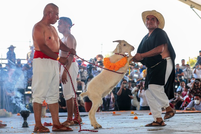 Posteriormente, el ballet de Tehuacán realizó el tradicional ritual de la matanza de chivos, celebrado en esta región del estado desde la época Colonial, desde finales del siglo XVI.