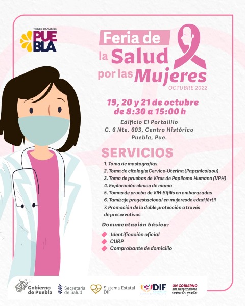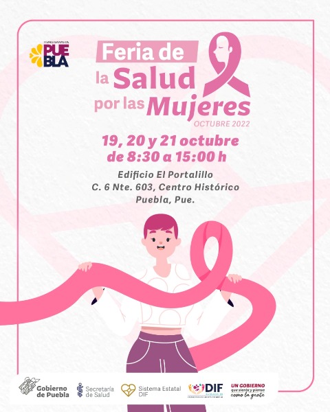 CIUDAD DE PUEBLA, Pue. – En conmemoración del Día Mundial de Lucha contra el Cáncer de Mama (19 de octubre) y con la finalidad de fomentar la sensibilización sobre la importancia de una detección temprana para mejorar el pronóstico y la supervivencia de los casos, el Sistema para el Desarrollo Integral de la Familia del Estado de Puebla (SEDIF) y la Secretaría de Salud realizarán la “Feria de la Salud por las Mujeres”, del 19 al 21 de octubre, en el edificio “El Portalillo” (calle 6 Norte No. 603, Centro Histórico, Ciudad de Puebla), en un horario de 08:30 a 15:00 horas.