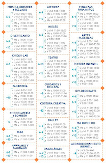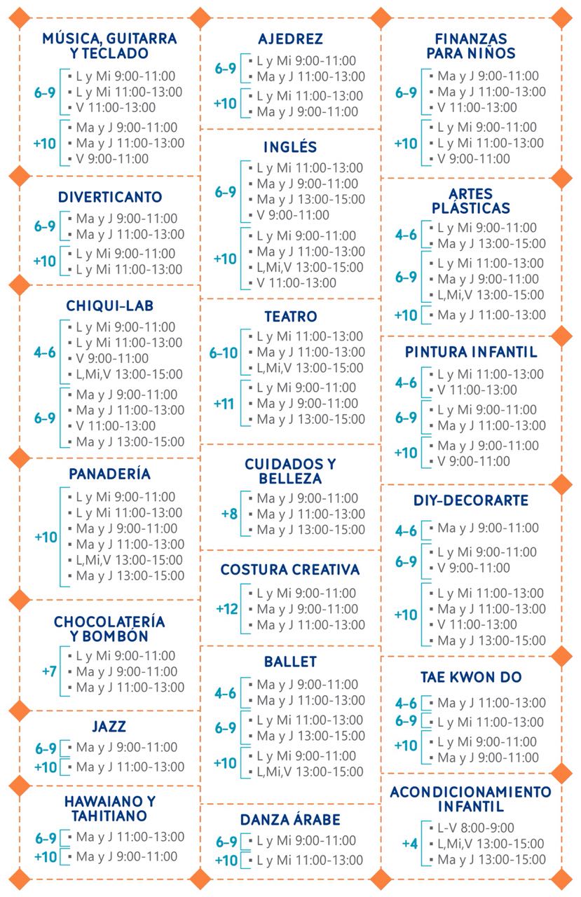 Los cursos que se ofrecen son: música, guitarra y teclado, ajedrez, finanzas para niños, diverticanto, inglés, artes plásticas, chiquilab, teatro, pintura infantil, panadería, cuidados y belleza, costura creativa, entre otros.