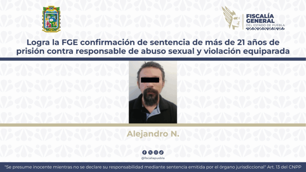La Fiscalía General del Estado de Puebla informa que quedó firme la sentencia de 21 años, 3 meses de prisión, dictada contra Alejandro N., como responsable de abuso sexual y violación equiparada, tras ser confirmada por el Tribunal de Alzada que analizó y desestimó la apelación presentada por la defensa del responsable.