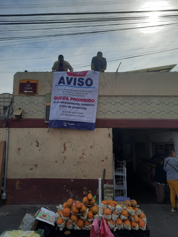 De igual manera, para prevenir la enajenación y acopio de productos explosivos y/o pirotecnia al interior de los mercados, se colocaron 65 lonas en los 23 Municipales, siete de Apoyo y en Central de Abasto; visitando y exhortando a seis mil 314 locatarios.